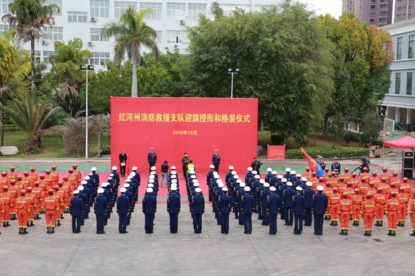2018年12月29日,红河州消防支队举行了迎旗授衔和换装仪式。州委副书记、州长罗萍出席仪式并讲话。州政府秘书长丁昆主持仪式。
