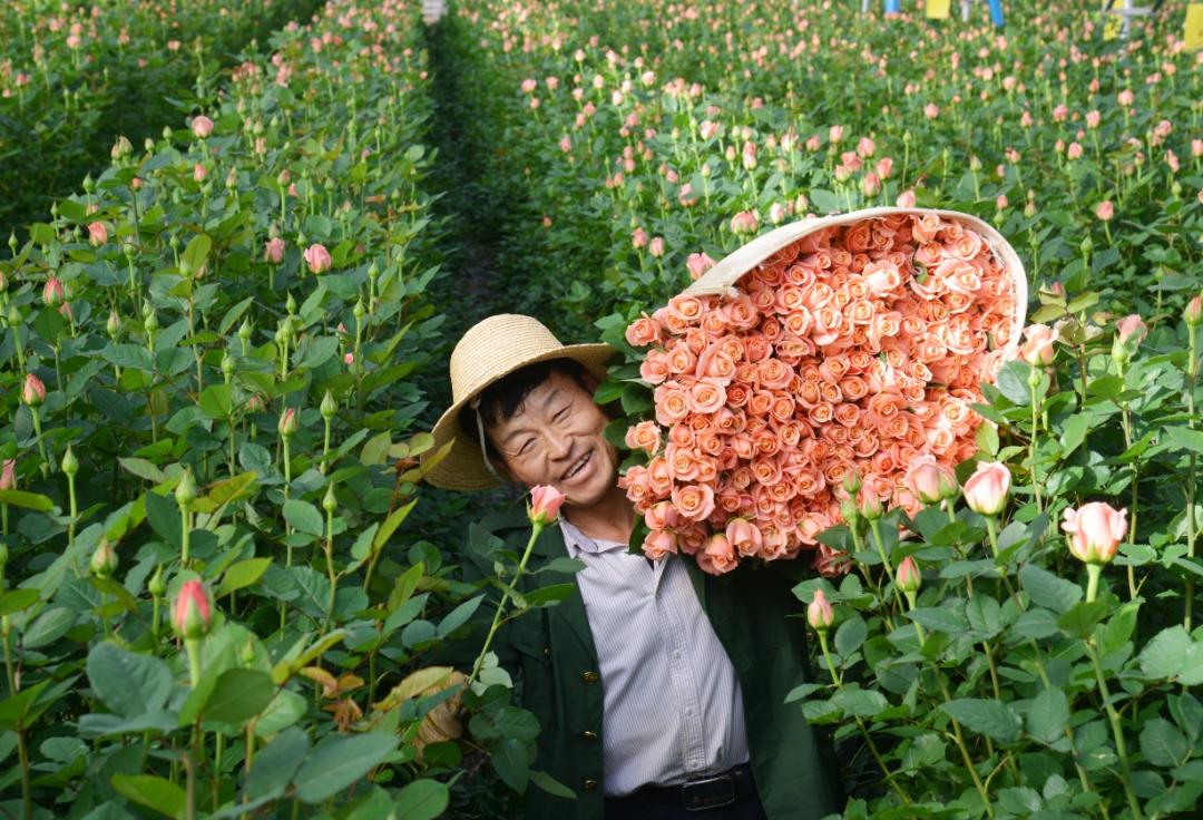 花农在昆明晋宁康龙花卉种植基地采收高品质的粉玫瑰。杨崇云 摄