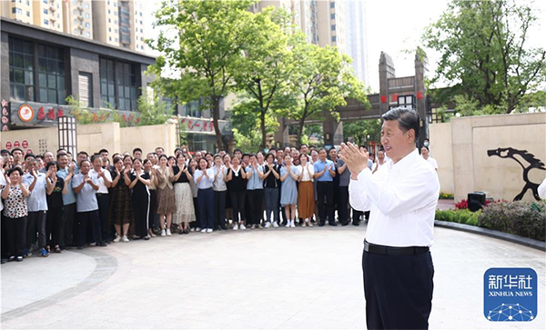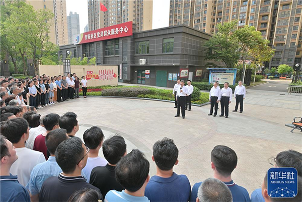 6月28日,中共中央总书记、国家主席、中央军委主席习近平在湖北省武汉市考察。这是28日下午,习近平在东湖高新区左岭街道智苑社区广场同干部群众亲切交流。新华社记者 李涛 摄