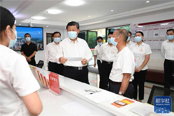 6月28日,中共中央总书记、国家主席、中央军委主席习近平在湖北省武汉市考察。这是28日下午,习近平在东湖高新区左岭街道智苑社区党群服务中心,向社区工作者了解党建引领基层社区治理及便民服务等情况,并同前来办事的老年人亲切交谈。新华社记者 谢环驰 摄