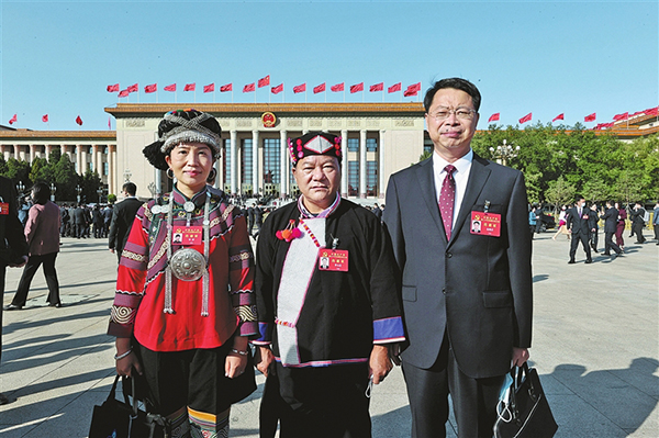 赵瑞君(右一)、罗萍(左一)、普玉忠(中)在人民大会堂前合影 云南日报记者 雷桐苏 摄