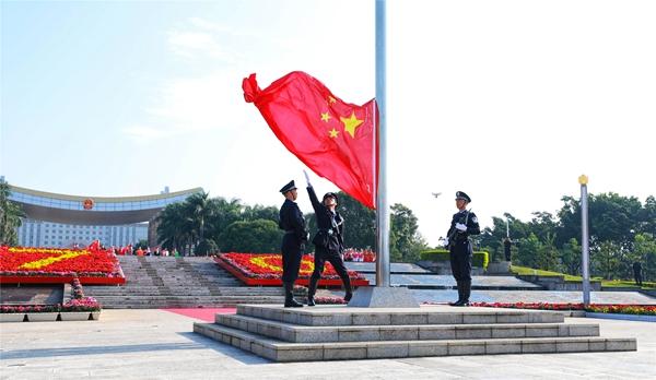 10月1日,红河州在蒙自红河会堂南广场举行庄严的升旗仪式,庆祝新中国成立70周年