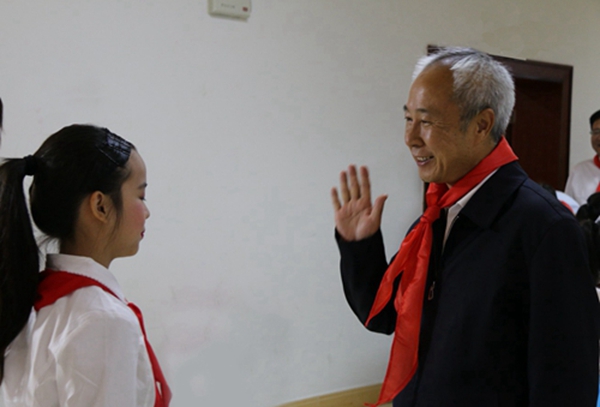 州委书记姚国华接受少先队员为其佩戴红领巾
