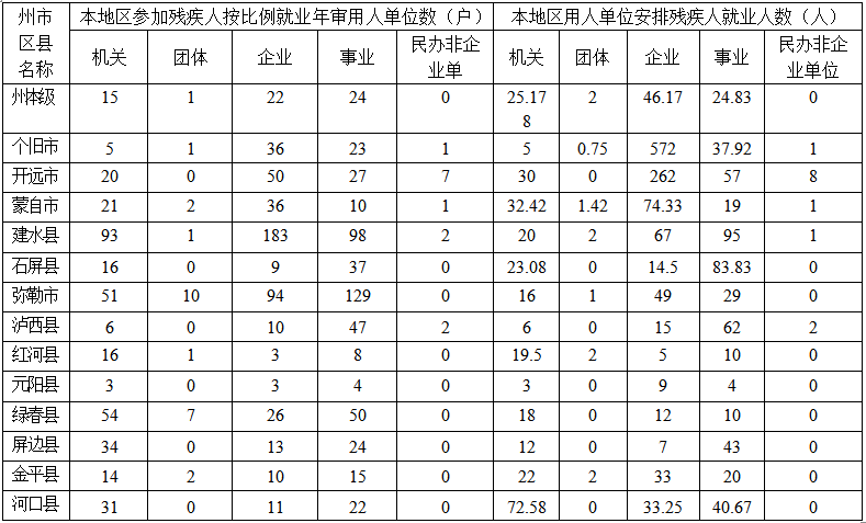 3.“本地区参加残疾人按比例就业年审用人单位数”和“本地区用人单位安排残疾人就业数”是根据“云南省残疾人按比例就业年审系统”中参加2019年度年审残疾人职工平均人数。