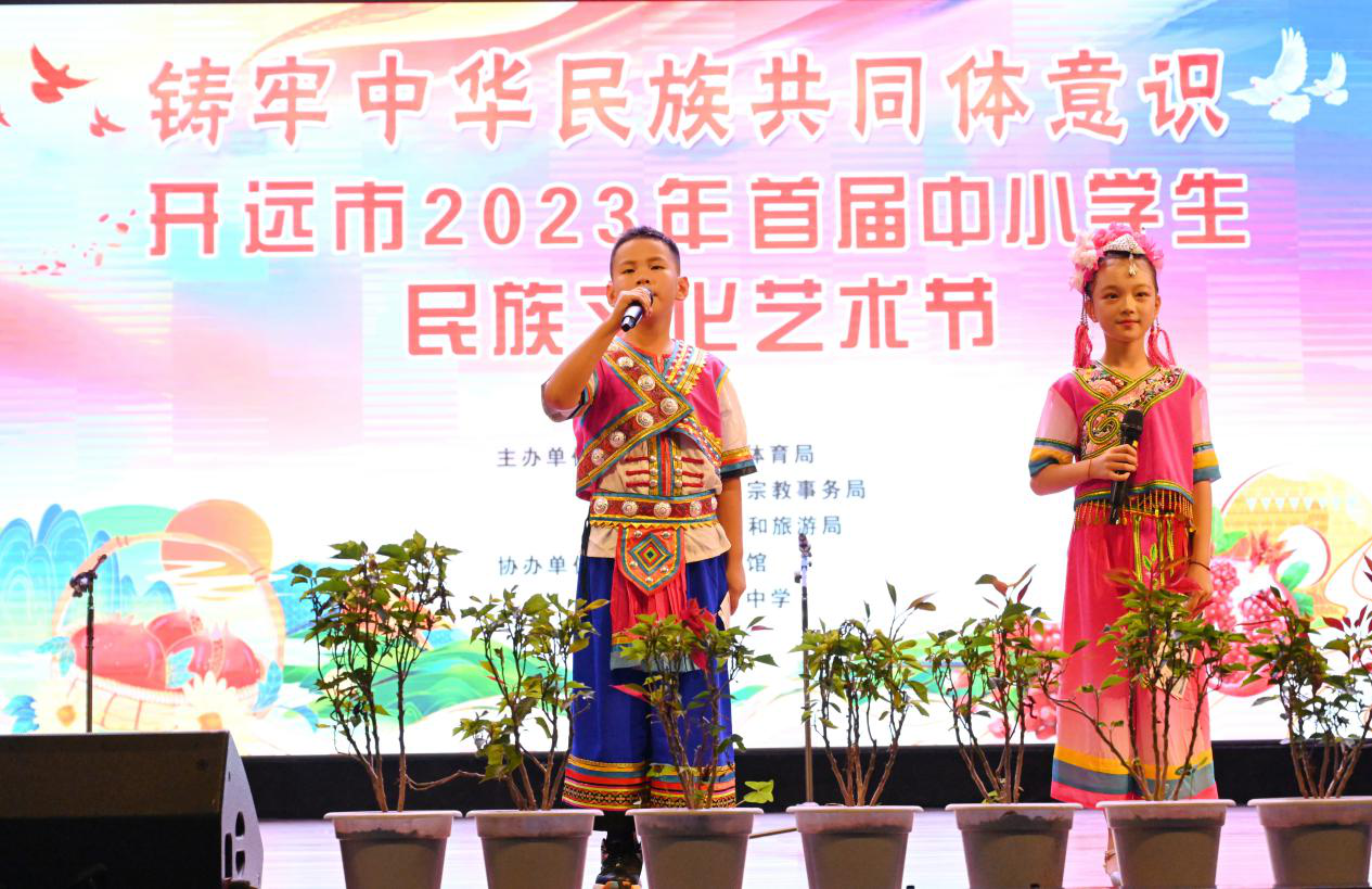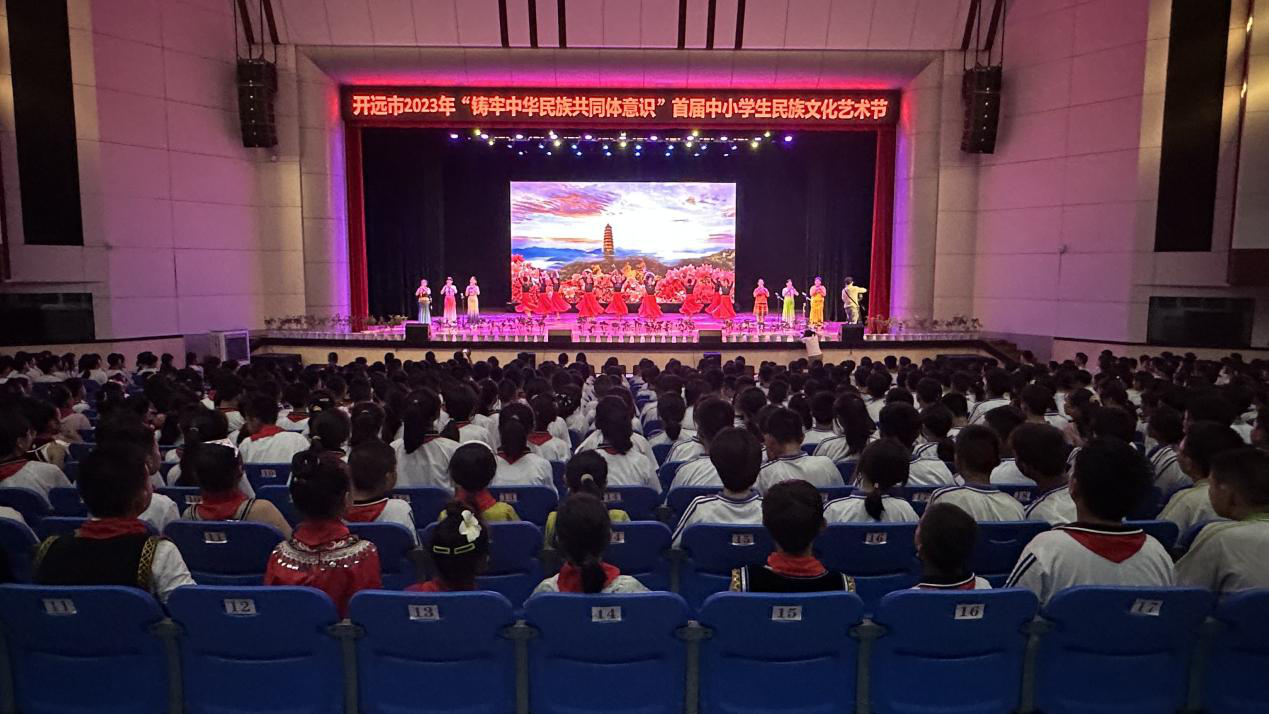 5月30日,由开远市教育体育局、市民宗局、市文旅局等单位联合举办以“铸牢中华民族共同体意识”为主题的首届中小学生民族文化艺术节在开远一中学生会堂拉开了帷幕。