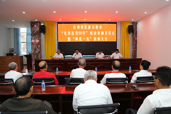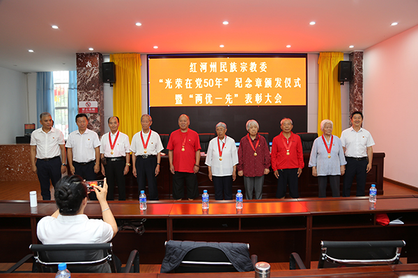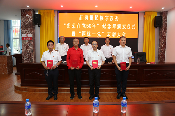 会上,全体党员干部一起唱国歌、重温入党誓词。邓志毅宣读了红河州民族宗教委直属机关党委关于“两优一先”表彰决定。李大海等7名共产党员荣获“优秀共产党员”称号,王熙来等4名党务工作者荣获“优秀党务工作者”称号,州民研所党支部荣获“先进基层党组织”称号。与会领导为在党50年的老党员颁发“光荣在党50年”纪念章,为“两优一先”获奖集体和个人颁发荣誉证书。