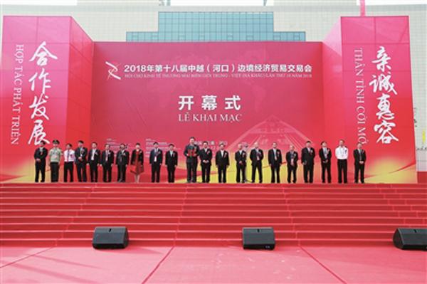12月4日,2018年第十八届中越(河口)边境经济贸易交易会(以下简称“边交会”)在河口隆重开幕。云南省人民政府副省长张国华,越南老街省人民委员会副主席黎玉兴,云南省人民政府副秘书长蒋兴明,中共红河州委书记姚国华,中共红河州委副书记、州长罗萍等出席开幕式。