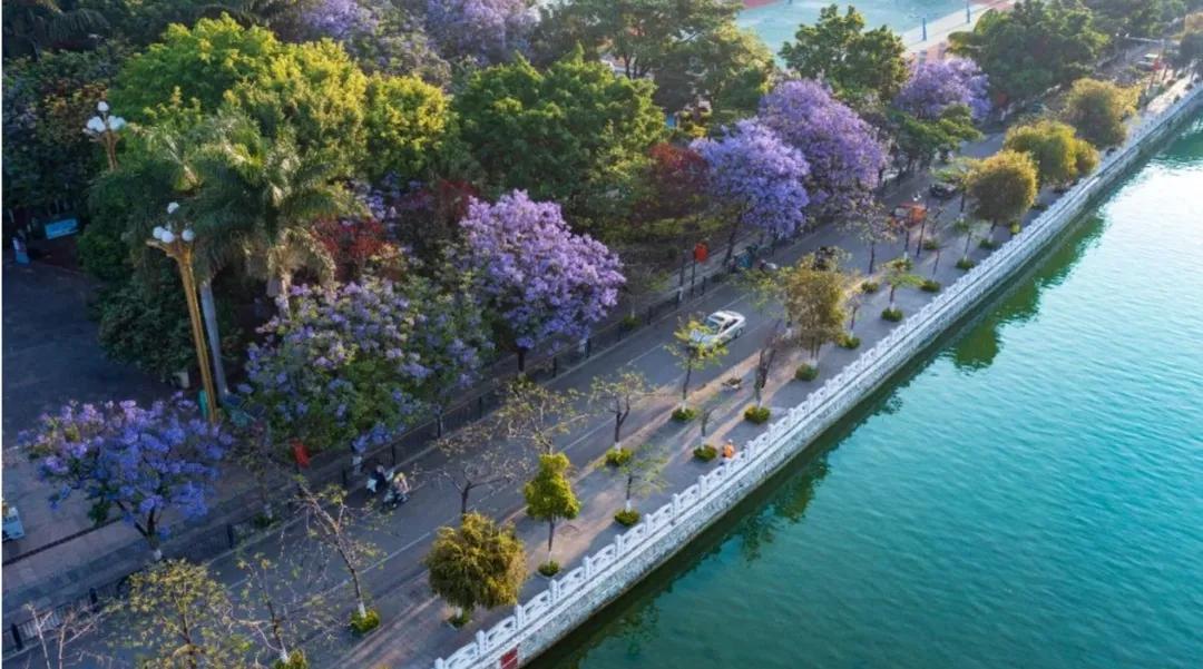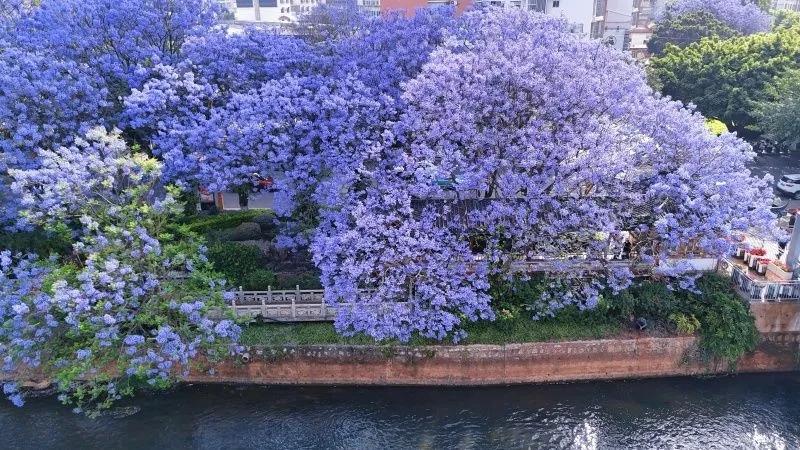 四月开始,开远的蓝花楹率先登场。伸展的枝丫盛满蓝紫色的花朵,为整座城市染上了一层浪漫的滤镜,泸江河蜿蜒流淌,花瓣簌簌飘落,美得动人心弦。