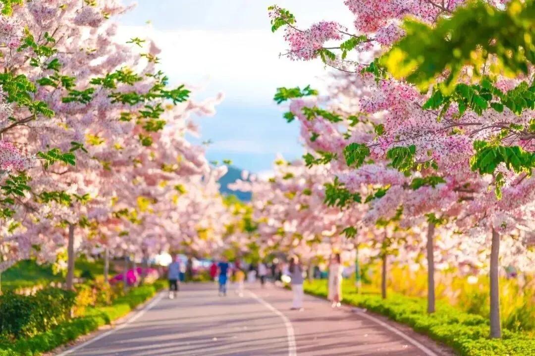 四月绽放的,还有石屏异龙湖畔的神黄豆花。粉色花海沿着湖畔缓缓铺开,为异龙湖染上了一层淡淡的粉意。微风拂过,粉白的花瓣轻柔摇曳,阳光透过枝叶洒下斑驳光影,为这片粉色云雾增添了几分梦幻。花海与碧波荡漾的异龙湖交相辉映,你可以沿湖畔的彩色步道骑行或漫步,或驻足凝望,或骑车穿行,每一帧画面都值得定格。