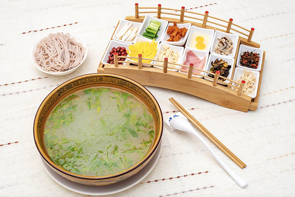 选用猪大腿和土鸡,提前熬制4小时以上得到的高汤,分别将胡椒、鸡油和猪油放入碗中,倒入熬制好的高汤,激发出各种食材的香味,依次放入鹌鹑蛋、脊肉片、鸡肉片、菊花、豆腐皮、豌豆泥、新鲜蔬菜,最后加入顺滑的米线,一口浓香。