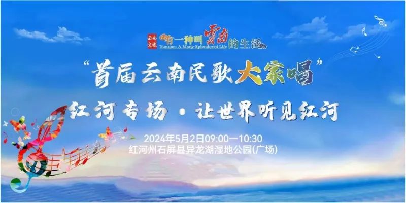 5月2日,由云南省文化和旅游厅、红河州人民政府主办,红河州文化和旅游局、云南省文化馆、云南省非物质文化遗产保护中心、石屏县人民政府承办的“有一种叫云南的生活——首届云南民歌大家唱”红河专场·让世界听见红河将在石屏县异龙湖湿地公园(广场)举办。