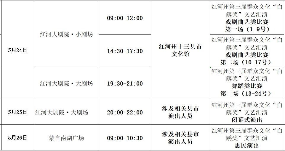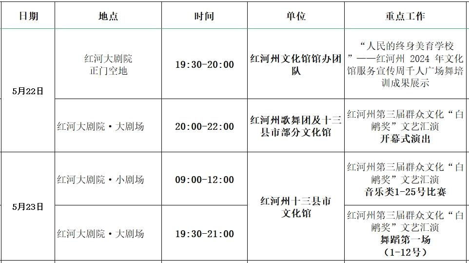 5月22日,由红河州文化和旅游局主办,红河州十三县(市)人民政府、红河州文化馆承办的红河州2024年第三届群众文化“白鹇奖”文艺汇演将在蒙自市红河大剧院拉开序幕。5月23日、24日进行节目汇演,5月25日闭幕,5月26日上午将在蒙自南湖广场举办惠民演出。