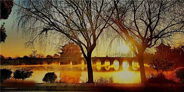 清晨,太阳冲破地平线,阳光从建水县双龙桥的桥孔下穿射而出,宛如油画般的场景,就这样展现在眼前。“金光穿洞”如梦似幻,绚丽光芒洒在江面上、屋顶上……好像给双龙桥镀上了一层温柔的滤镜无尽浪漫。