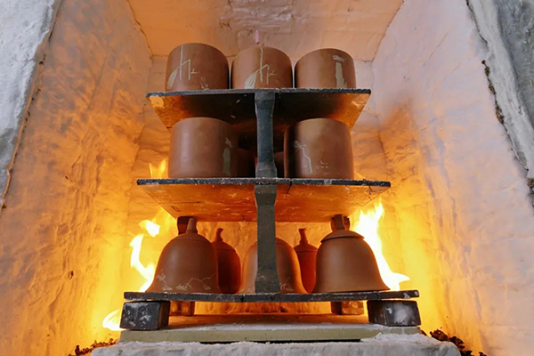 建水紫陶的烧成温度要求在1150℃~1200℃之间。传统烧制建水紫陶的炉窑称为龙窑,窑内点火燃烧后,在不同的火温和窑气下,陶坯内所含的各种成分会呈现不同的还原结构和还原色彩,达到相应的高温时,会呈现或红或紫或黑的奇异变化,形成建水紫陶有别于其他陶瓷的窑变特色。