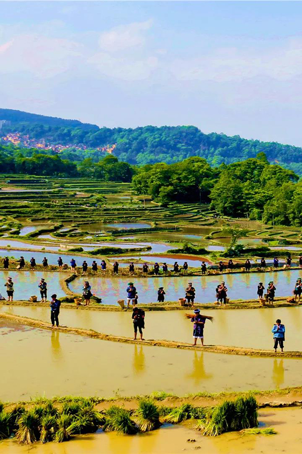 自然交响——千年哈尼梯田是山与水、天与地、人与自然的交响乐,谱写着自然四季乐章。在春风的吹拂下,秧苗新插,水天一色间夹杂点点新绿,满目都是一派生机。夏日里的红河哈尼梯田,被翠绿掩盖起来,一眼望去翠色欲流。深秋时节,稻谷成熟,夕阳余晖下满山遍野金黄灿烂。冬日里梯田里蓄满了水,犹如一块块明镜镶嵌于沟谷之中。