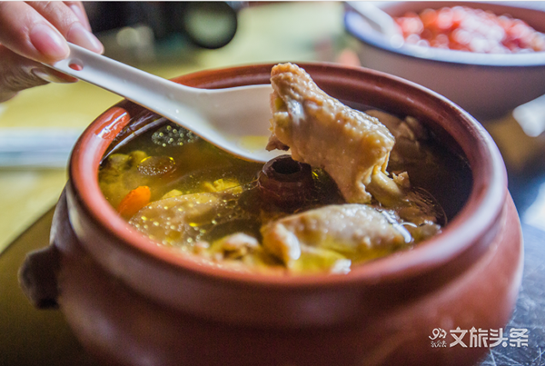 汽锅鸡,始创于建水的汽锅鸡,以做法独特、肉质细嫩、汤味香醇、鲜美适口在国内外享有盛誉。汽锅鸡的制作方法十分独特,盛放蒸制食材的器皿——汽锅,是用享有中国“四大名陶”之一声誉的建水紫陶制作而成,其锅底有一型似喇叭的构件通入汽锅内,蒸气由此进入将食材蒸熟,一道美味佳肴——汽锅鸡就做成了。