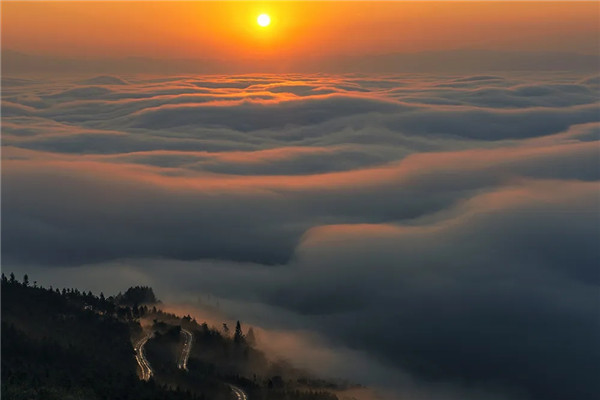 清晨,白色的雾气从山谷中缓缓升起,很快弥漫开来,时隐时现,似真似幻。随着一轮红日从天边升起,红光四射,厚厚的云海被阳光染红,好像朝阳下的大海一样,波涛汹涌,云浪滔天。