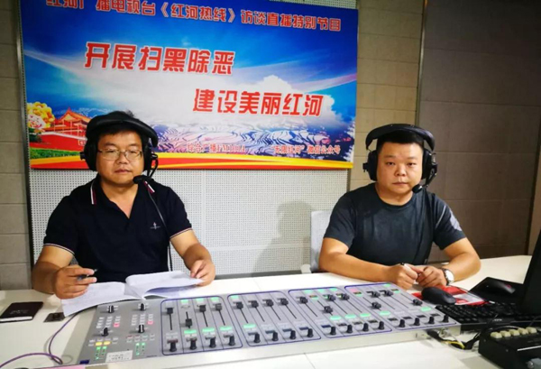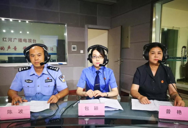 5月21日上午, 个旧市委政法委副书记、市扫黑办主任李保福带领个旧市公安局副局长、市扫黑办常务副主任陈波,个旧市人民检察院副检察长包颖,个旧市人民法院副院长普艳走进《红河热线》直播间,与听众和网友交流个旧市“开展扫黑除恶建设美丽红河”工作开展情况及取得成效,并就扫黑除恶专项斗争相关案例进行了详细介绍。