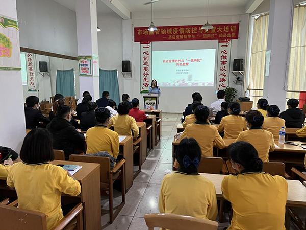 2022年5月6日,红河州市场监督管理局、蒙自市市场监督管理局到云南鸿翔一心堂药业(集团)股份有限公司红河一分部开展市场监管领域疫情防控与处置“大培训”,从严从细压实企业疫情防控责任。一心堂红河一分部总经理、部门经理、区域经理等中层领导及部分门店营业员等40余人参加此次培训。