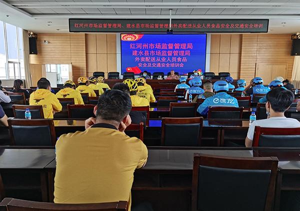 为防控和降低网络餐饮服务食品安全风险,加强外卖平台疫情防控监管,提高外卖“骑手”健康防护意识,保障广大消费者网络订餐食品安全,5月12日下午,红河州市场监督管理局、建水县市场监管局联合开展网络外卖送餐人员食品安全知识暨交通安全培训活动,美团、饿了么两家平台共50余名骑手参加培训。