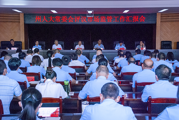 州市场监管局局长向爱武作评议自检自查报告。报告从执行宪法和有关法律、法规的情况,执行国家方针政策的情况,依法履行职责的情况,执行州人大及其常委会决议、决定的情况,办理州人大代表提出的建议、批评和意见以及州人大常委会审议意见的情况,勤政廉政的情况等六个方面,对州市场监管局依法履职情况进行了汇报。并对存在的问题和不足以及下一步工作打算进行了自检自查。
