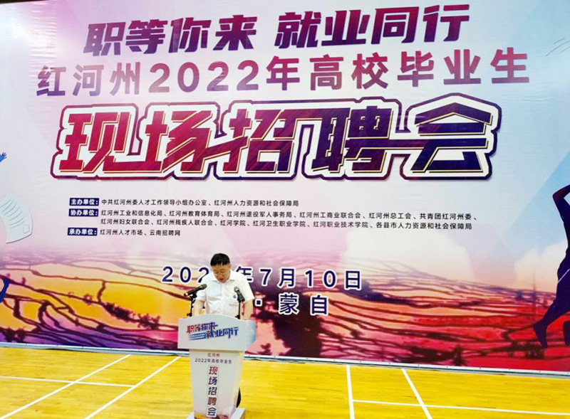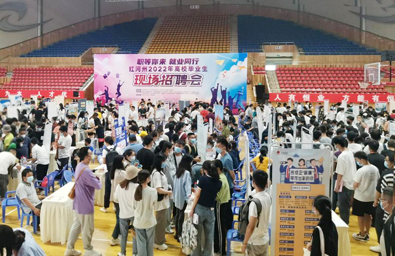为贯彻落实党中央、国务院和省、州党委、政府“稳就业”“保就业”决策部署,切实推动高校毕业生实现就业,同时也为红河州进一步引才聚才,推动红河州经济社会高质量发展,7月10日在红河州体育馆举办“职等你来 就业同行”——红河州2022年高校毕业生现场招聘会。招聘会共有用人单位142家,提供涉及销售、教育、医疗、设计、财务、工程等7544个就业岗位。