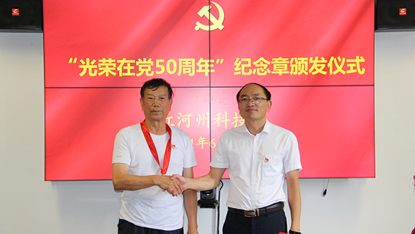 6月24日,红河州科技局举行“光荣在党50年”纪念章颁发仪式。州科技局党组书记、局长刘杰为党龄达到50周年的老党员颁发了“光荣在党50年”纪念章,向他们转达党中央的亲切关怀,并致以诚挚问候。