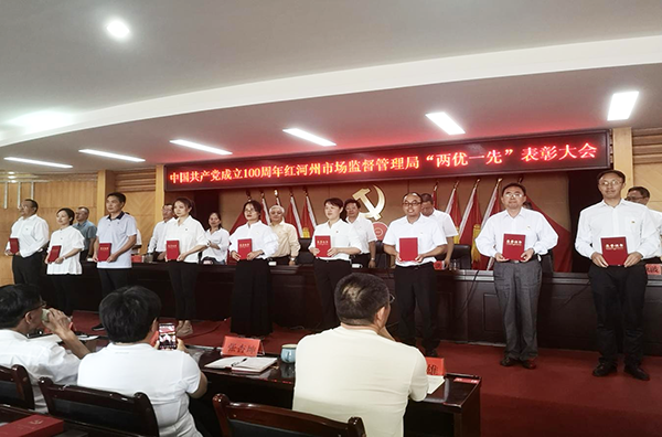 为庆祝中国共产党成立100周年,6月29日,红河州市场监督管理局举行“两优一先”表彰大会暨党员宣誓活动。州委党史学习教育第18巡回指导组成员,州市场监督管理局党政领导班子成员、中共党员、预备党员入党积极分子和科室非中共党员负责人等共179人参加了会议。