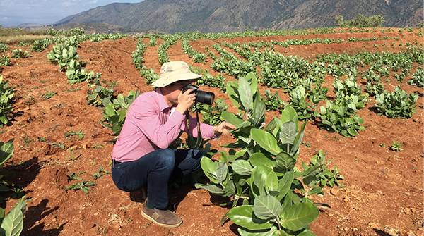 许建初观察干热河谷天然纺织纤维植物——牛角瓜的生长情况