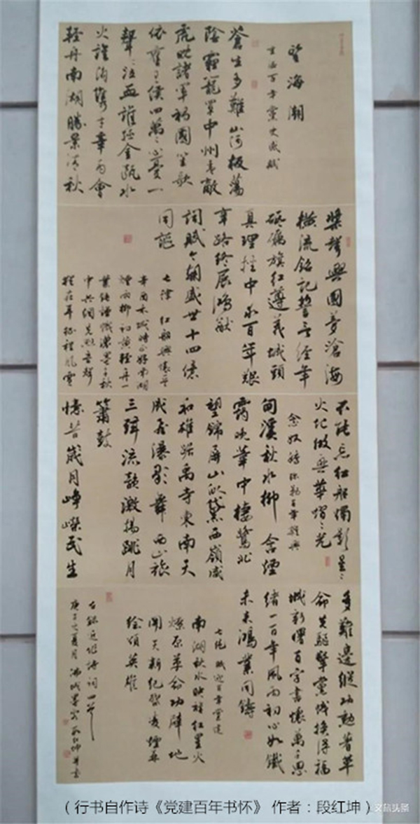 20日上午,美术、书法、摄影三个艺术门类的作品在普洱市美术馆展出。红河州书法类作品有《岳阳楼记》,行书自作诗《建党百年书怀》《录山谷题跋数则》《王亚平南湖诗》,草书《徐霞客滇游日记》,行草书《晁错论》《贾谊论》,潘天寿话谈用笔;美术类作品有《民情日志》《时代印记——手机》《守望家园》《红色记忆》;摄影类作品有《小镇的早晨》《春耕》。