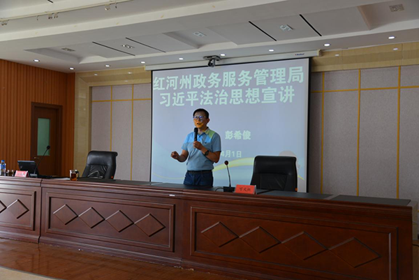 2021年4月1日,红河州政务服务管理局组织全体干部职工及进驻政务服务中心部门窗口人员在510室开展习近平法治思想宣讲活动。