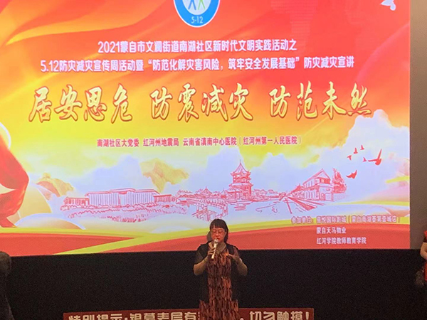 结合新时代文明实践活动,推进防震减灾知识进社区。5月10日,结合创文工作,州地震局组织人员到蒙自市南湖社区南湖荟商业中心开展防震减灾科普知识宣讲,让大家掌握地震应急知识。随后,在电影城组织开展了一场地震应急演练,在演练中检验对突发地震灾害的应急反应和处置能力,做到防震创文两不误。