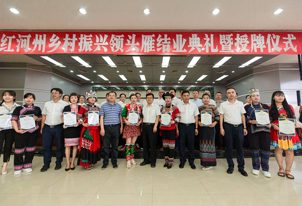 仪式上,州级参会领导为28名优秀学员代表颁发结业证书,并向红河州农民科技教育培训中心授予“领头雁计划红河州孵化基地”牌匾。