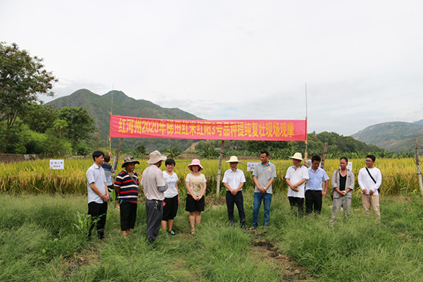 2020年6月24日,红河州农科院在元阳县南沙镇排沙村举行梯田红米红阳3号品种提纯复壮现场观摩会。州农科院院长李勇成、副院长洪健康,元阳县农业农村和科学技术局局长牟垚、元阳县粮食和物资储备局局长朱艳桃、元阳县粮食购销有限公司经理沈鸿文等领导参会。