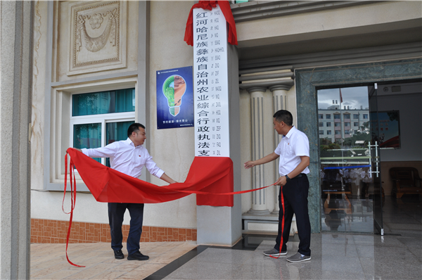6月30日上午,红河州农业农村局在蒙自市举行新组建的“红河哈尼族彝族自治州农业综合行政执法支队”揭牌仪式。州委农办主任、州农业农村局党组书记、局长赵珖菻和副局长胥校生为执法支队揭牌。局领导班子、执法人员、局机关各科室和局直单位负责人参加仪式。