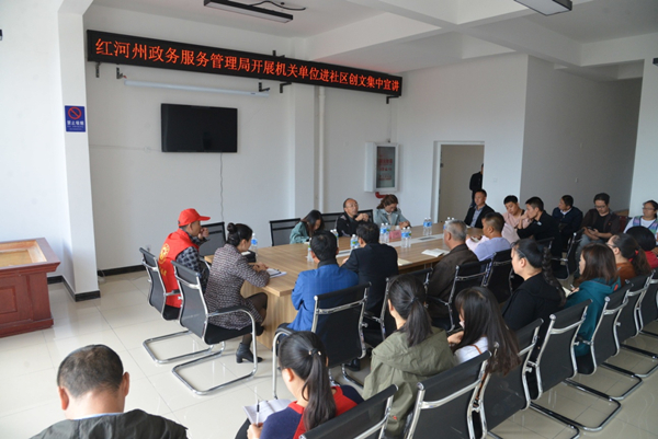 10月30日,红河州政务服务管理局9名党员组成创文活动小组,在王志成副局长带领下,到蓝天社区及包保小区(南湖花园)开展“心连心.同创文”、在职党员进社区活动