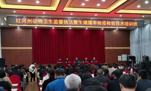 11月25日-26日,红河州动物卫生监督执法暨生猪屠宰检疫检验技术培训班在红河州经作站培训中心成功举办,州农业农村局有关科室及局属有关单位负责人、各县市农业农村局分管副局长及畜牧兽医科负责人、州县动物卫生监督所有关人员、部分乡镇官方兽医、生猪屠宰负责人及肉品品质检验技术人员共320余人参加培训。