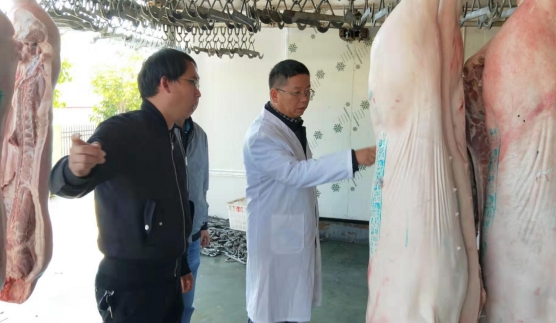 州动物卫生监督所人员1月7日在石屏县万园之园食品有限公司检查生猪屠宰情况