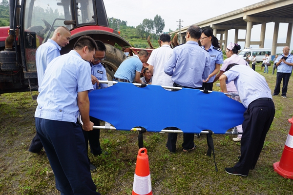 “事故”发生后,驾驶员及时报案,农机、110、120三部门积极响应,同时展开救援。开远市农机部门接到事故报案后,立即启动农机事故应急预案,迅速组织事故救援组、事故勘察组及后勤保障组人员赶赴现场,各组迅速投入到工作中,抢救伤员、拉警戒线、保护现场、维持秩序,做好现场勘查、询问笔录、人员伤亡和财产损失情况记录等,工作紧张有序地进行。