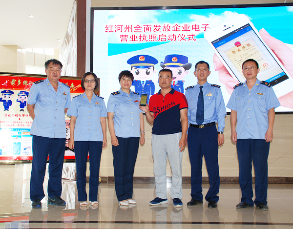 6月20日,红河州工商行政管理局在红河州政务服务中心办证大厅举行了红河州全面发放企业电子营业执照启动仪式,州工商局局长钱桂芹向红河州华尔安全生产注册工程师事务所(有限合伙)事务执行人颁发了红河州第一份电子营业执照。
