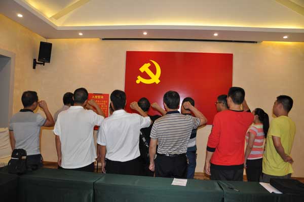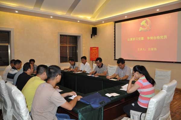在党性教育室,红河州地震局党组书记、局长宗继伟为全体党员上了一堂以《认真学习党章,争做合格党员》为题的党课。全体党员在音乐的伴奏下,高亢激昂地高声歌唱《没有共产党就没有新中国》。面对党旗重温入党誓词,在党旗下接受心灵的净化和洗礼,牢记共产党员的政治责任和历史使命,不断保持共产党员的先进性和纯洁性。