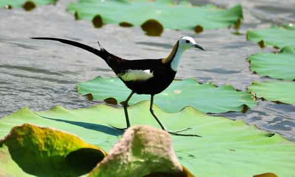 近年来,随着异龙湖国家湿地公园的建设,生态环境的逐渐改善和人们爱鸟护鸟意识的增强,一批批珍稀野生鸟类如紫水鸡、钳嘴鹳、黑翅长脚鹬、大麻鳽等陆续栖息异龙湖。7月14日,正值荷花盛开的时节,笔者在石屏县异龙湖国家湿地公园拍摄荷花时,惊喜发现两只素有“凌波仙子”之称的珍贵水鸟——水雉。水雉的现身,使异龙湖国家湿地公园野生鸟类家族喜添新成员。