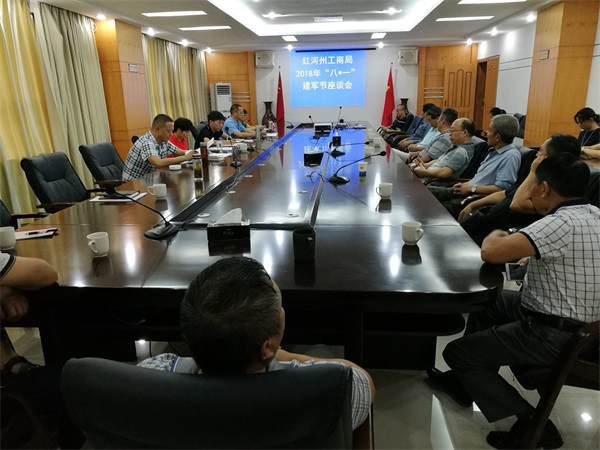 在“八一”建军节即将到来之际,7月25日下午,红河州工商局在该局五楼多功能会议室召开庆祝中国人民解放军建军91周年暨军转干部“八一”座谈会。局党组班子成员、相关科室负责人及部分军转干部参加会议。