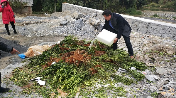 1月30日,河口县植保站执法人员与桥头乡农技站农技人员集中销毁了2017年12月31日收缴的未经检疫擅自调运的柑桔苗木计1440株,净化了我州果树苗木市场,维护了我州桔柑种植产业的健康发展。