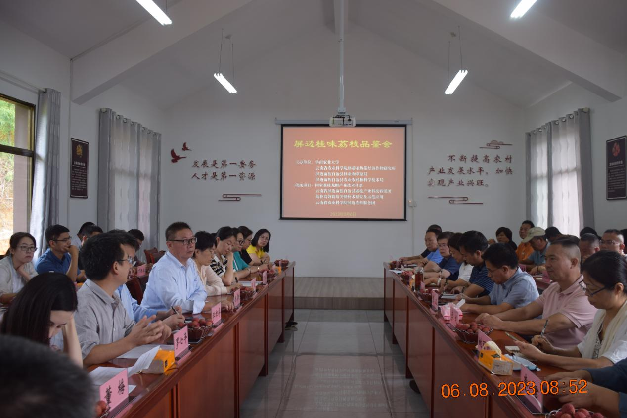 2023年8月6日,屏边桂味荔枝现场品鉴与产业发展座谈会在云南屏边召开。国家荔枝龙眼体系岗站专家团队、省内同行专家、屏边县委县政府和相关技术部门、基层农技人员、企业和种植大户90余人参加。会议由云南省荔枝科技特派团团长张惠云副研究员主持,屏边县政府吴红昌副县长代表县委县政府致辞。