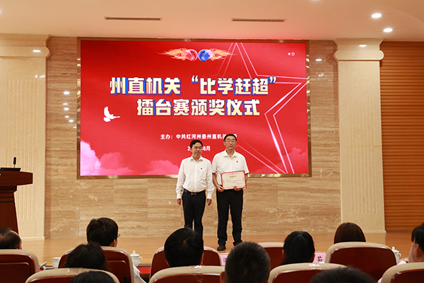 8月9日上午,红河州政务服务管理局党支部在州直机关获“比学赶超擂台赛”一等奖。