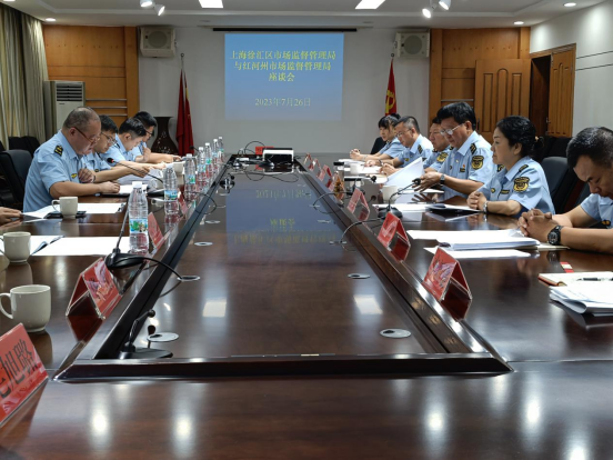 为深入贯彻落实习近平总书记关于深化东西部协作和定点帮扶工作的重要指示批示精神,深化上海市徐汇区与云南省红河州的帮带扶持,7月26日,上海徐汇区市场监管局党组成员、副局长马如㼆带队到红河州市场监管局调研。红河州市场监管局党组书记杨国椿、局长向爱武和有关领导、科室负责人参加座谈。