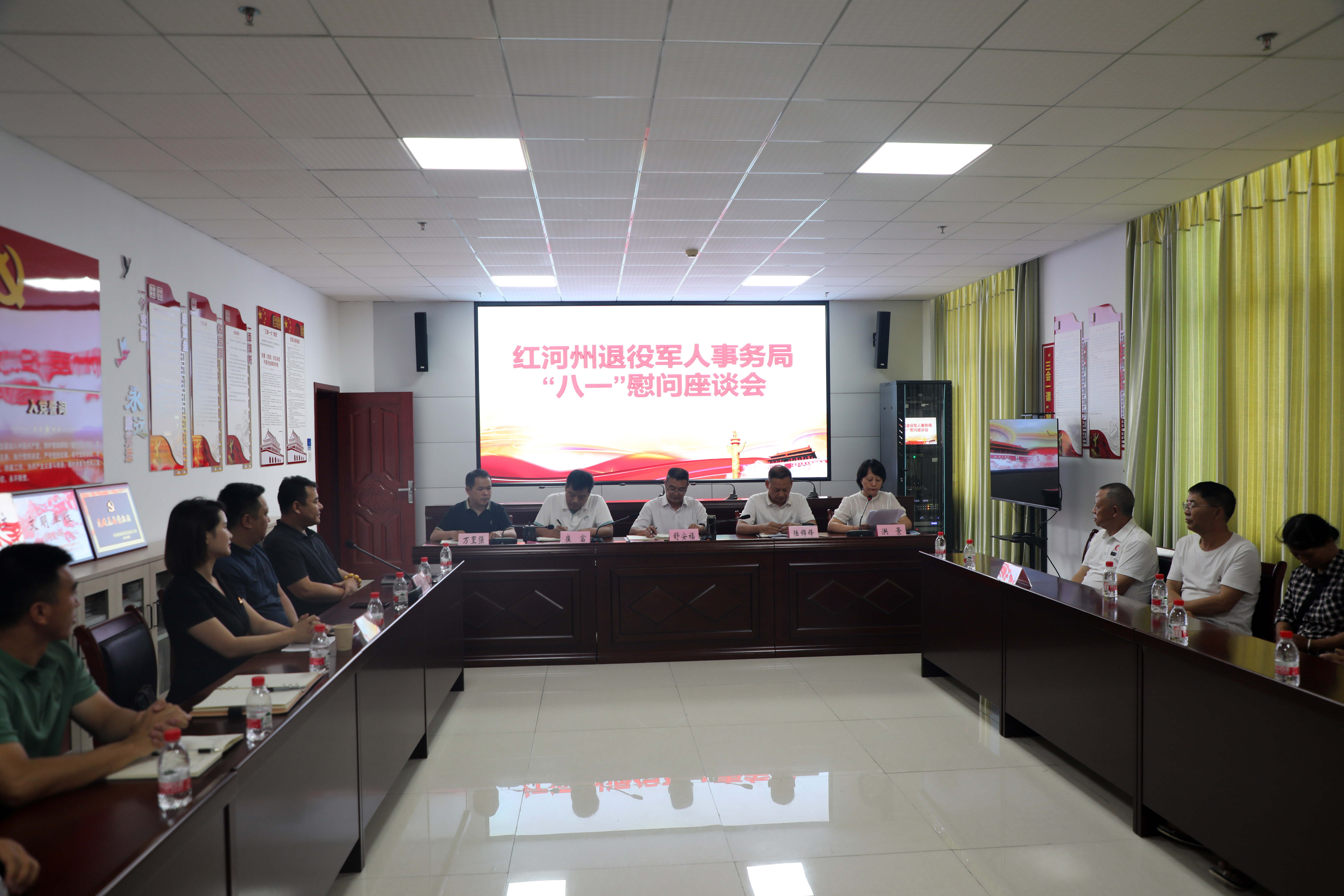 为进一步弘扬拥军优属优良传统,营造尊崇关爱退役军人的社会氛围,7月27日,红河州退役军人事务局组织召开“八一”慰问座谈会,局党组书记、局长舒安福出席会议并讲话,州和蒙自市退役军人事务局有关负责同志及退役军人、烈士遗属、最美退役军人、军创企业、拥军企业代表参加会议。