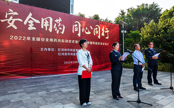 11月24日,红河州2022年“安全用药月”启动仪式在红河县举行。活动围绕“安全用药,同心同行”主题,现场发放安全用药宣传资料2000余份,制作展出科学用药宣传展板10块,现场接受群众用药咨询、义诊300余人次,滚动播出安全用药科普短视频,有效提高大家的安全用药意识和自我保护能力。