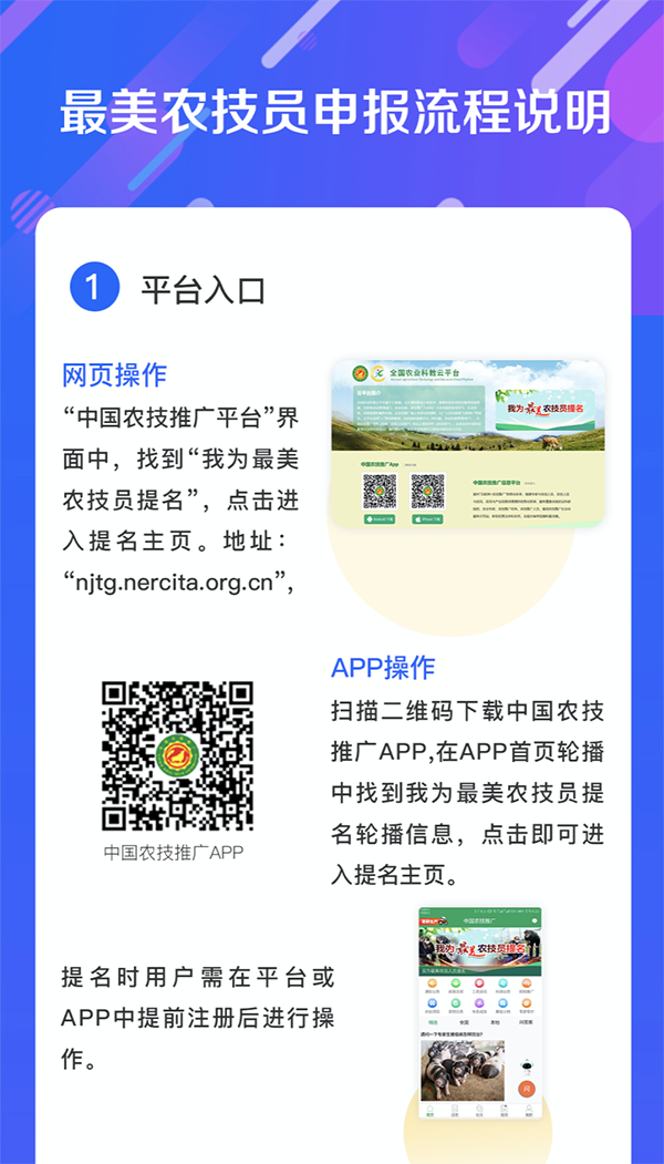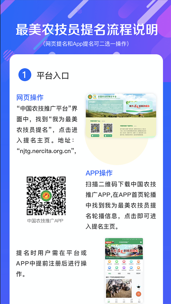 1.中国农技推广信息平台APP、网站(njtg.nercita.org.cn)将开设“寻找最美农技员”专栏,接受广大农民和新型经营主体等农技服务对象以实名实情、实事实例提名“最美农技员”。推荐人选应有3个以上服务对象网上提名。